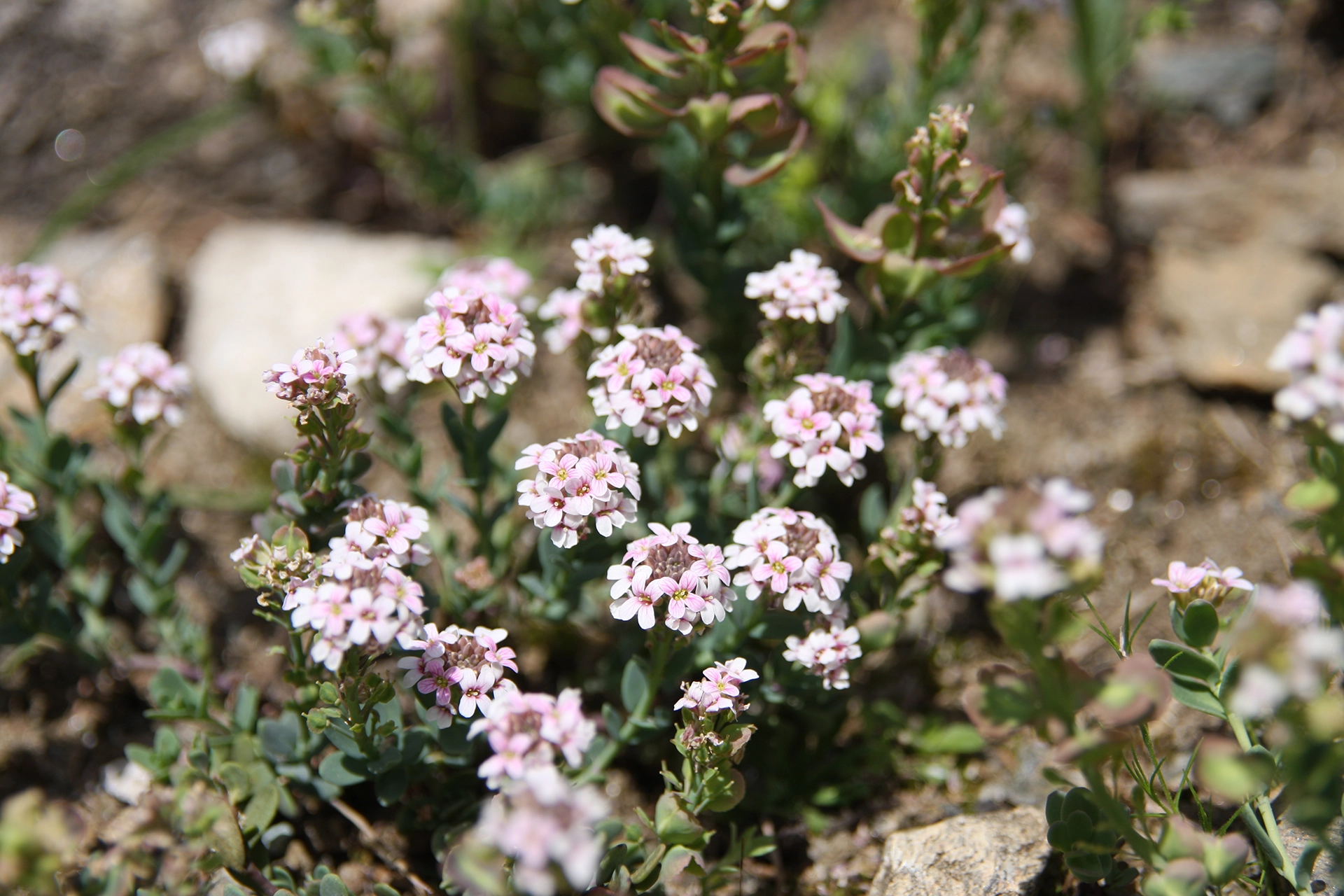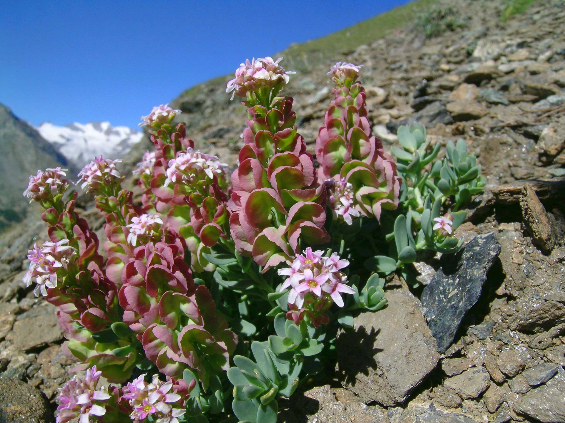 This species is easy to recognise, but is very rare and therefore difficult to find. In Italy, it is present in small sites in Piedmont and the Aosta Valley alone, where it is found exclusively on the orographic right side of Cogne Valley. It is a small creeping plant that has very close, elliptical-shaped leaves that are green-blue in colour. The flowers are united in short raceme inflorescences, which are elongated at fructification; they are light pink in colour with darker streaks. The fruits, which are very characteristic, are roundish silicles with wide wings, that are often tinged with violet.